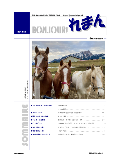 スイスの経済・社会・政治に関する時事、役に立つ生活情報、会員によるテーマ別コラム、当地のイベント情報、JCGの活動情報など、毎号豊富な話題をお届けします。会報のバックナンバーは「会員専用ページ」(要パスワード)からご覧いただけます。