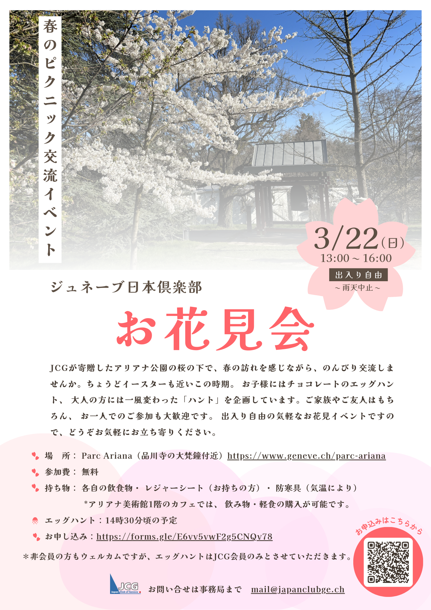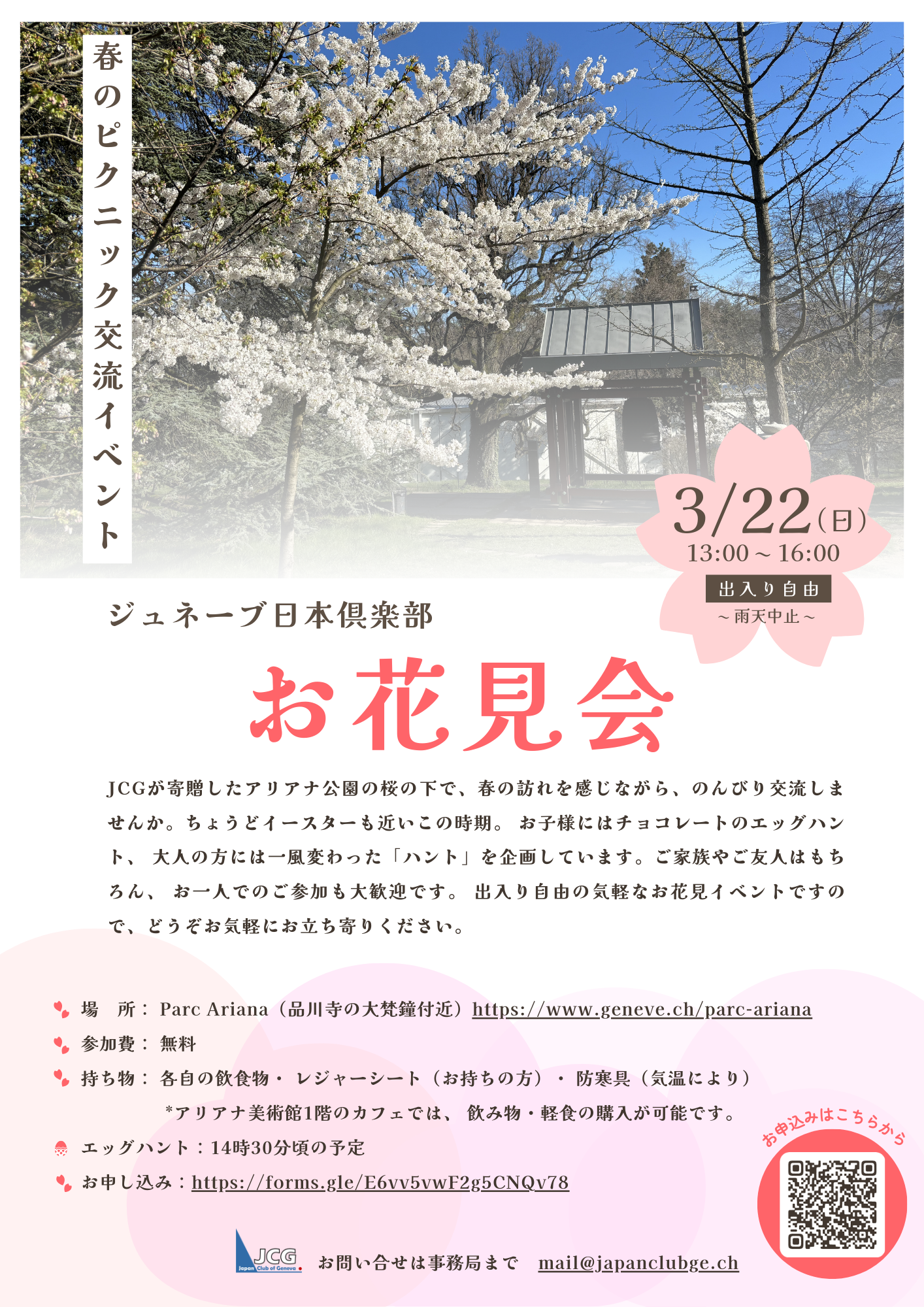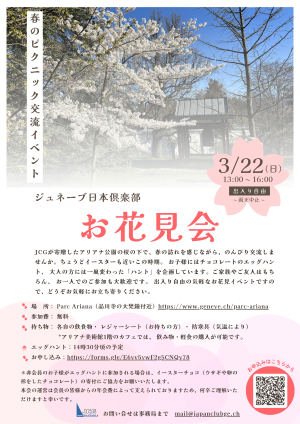JCGが寄贈したアリアナ公園の桜の下で、春の訪れを感じながら、のんびり交流しませんか。ちょうどイースターも近いこの時期。 お子様にはチョコレートのエッグハント、 大人の方には一風変わった「ハント」を企画しています。ご家族やご友人はもちろん、 お一人でのご参加も大歓迎です。 出入り自由の気軽なお花見イベントですので、どうぞお気軽にお立ち寄りください。