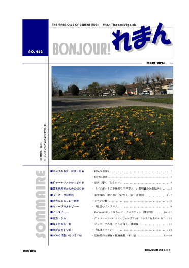 スイスの経済・社会・政治に関する時事、役に立つ生活情報、会員によるテーマ別コラム、当地のイベント情報、JCGの活動情報など、毎号豊富な話題をお届けします。会報のバックナンバーは「会員専用ページ」(要パスワード)からご覧いただけます。