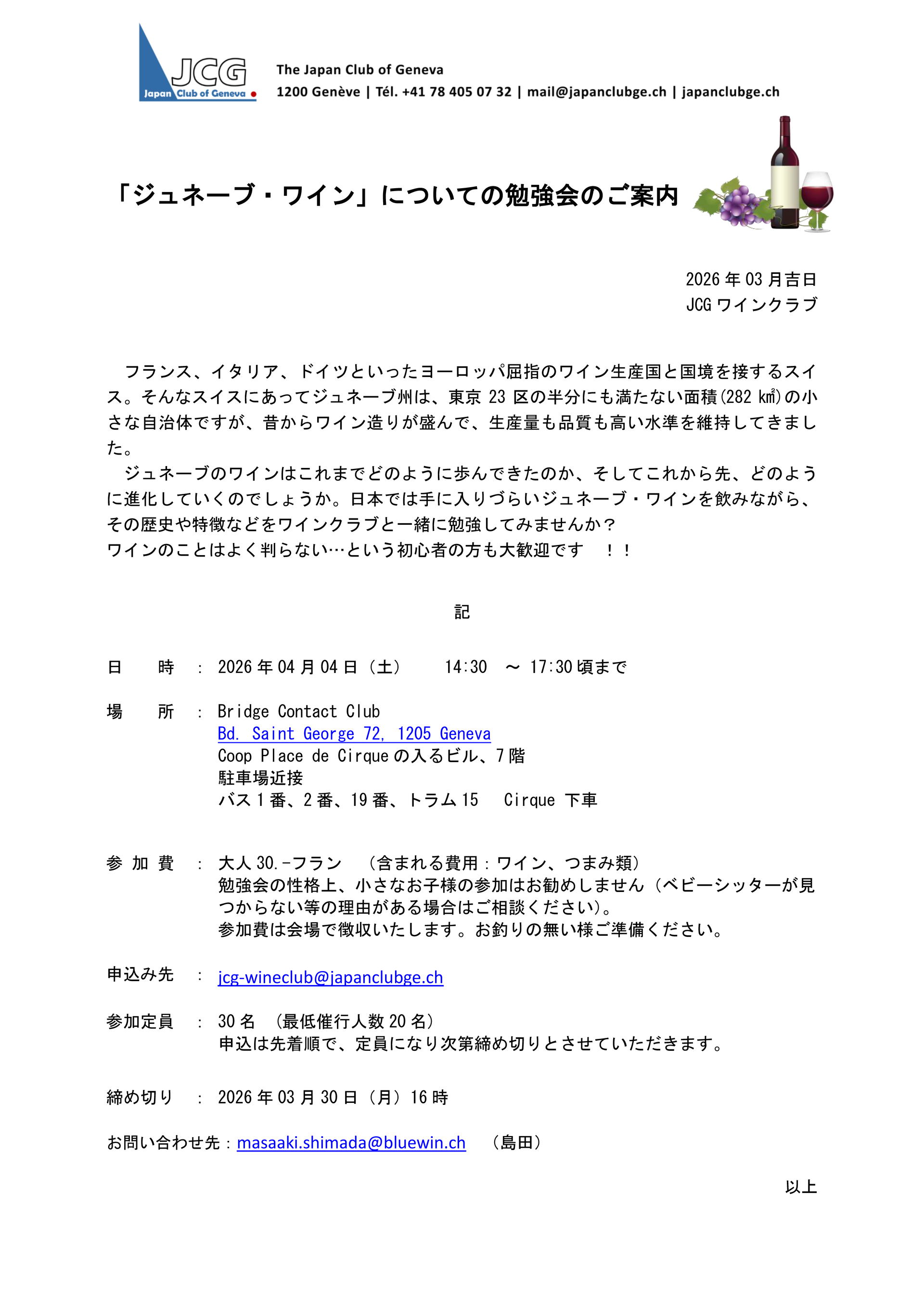 広告・掲示板等を掲載ご希望の方は3月24日(火)までに事務局(mail@japanclubge.ch)までご連絡ください。