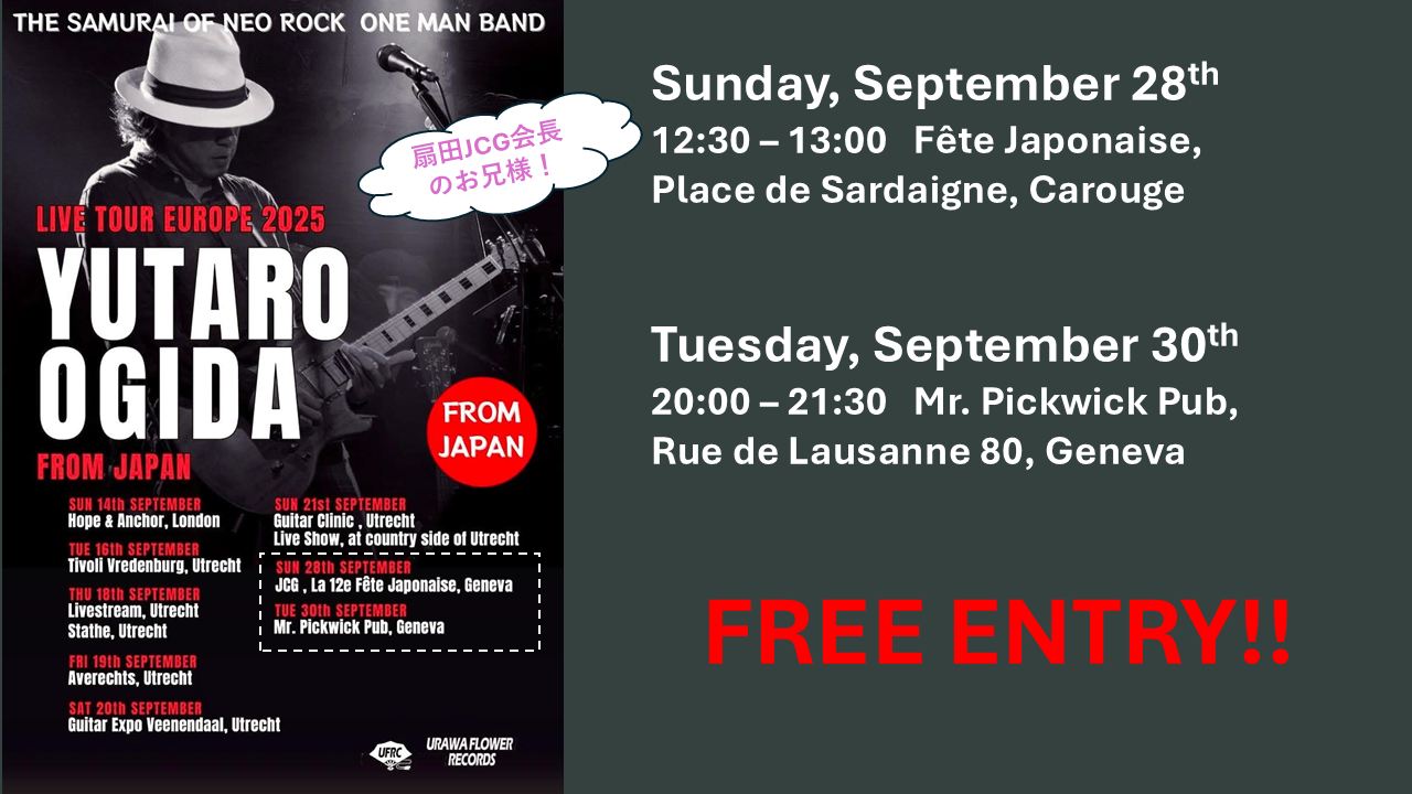 現在ヨーロッパツアー中の、日本を拠点に活動するプロミュージシャン・扇田裕太郎氏は、ジュネーブ日本倶楽部・扇田会長のご兄弟でもあります。